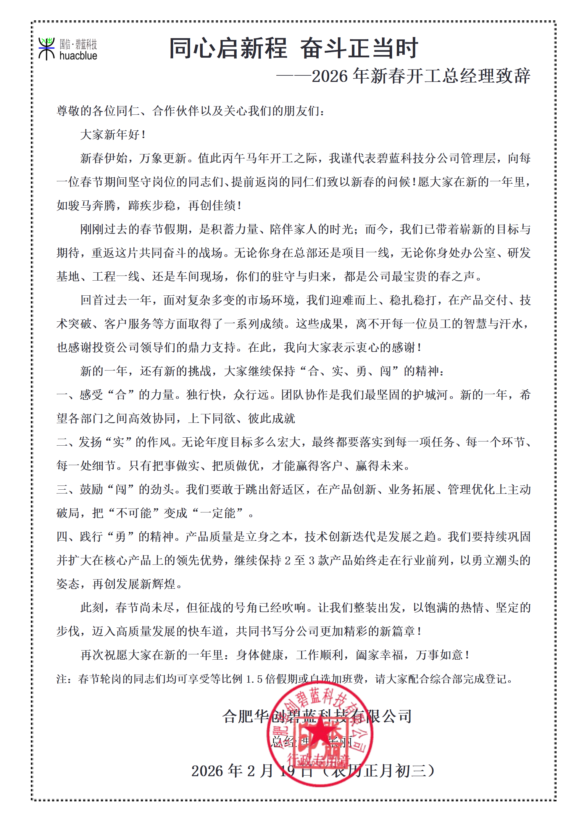 同心启新程 奋斗正当时 ——2026年新春开工总经理致辞
